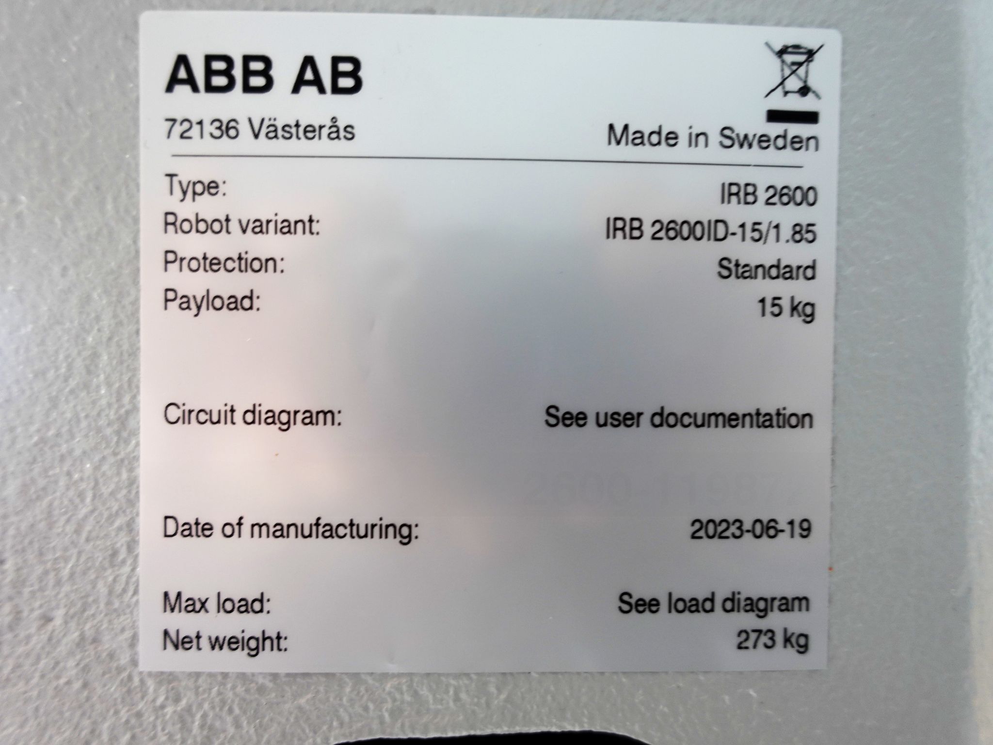IRB 2600ID-15/1.85, hergestellt am 19.06.2023 in Schweden.